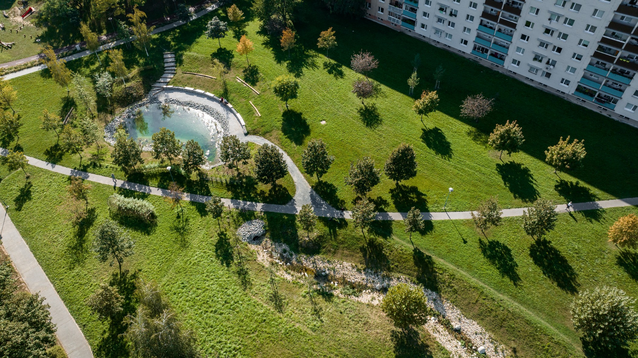Soseska je tako pridobila skupnostne vrtove, igrišča in športne površine, celo tekaško stezo. Zasadili so tudi nova drevesa in trajnice ter posebno pozornost namenili vodnim elementom. Skozi sosesko teče potok, uredili pa so tudi manjši ribnik.