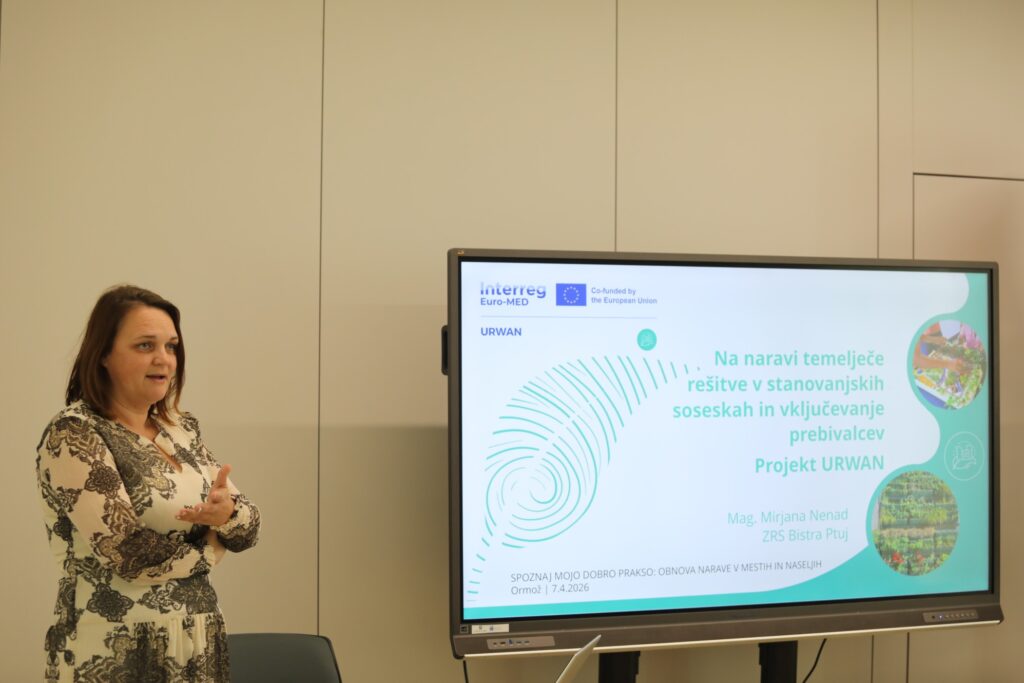 Mirjana Nenad z ZRS Bistra Ptuj je predstavila projekt URWAN, ki se osredotoča na v vključevanje na naravi temelječih rešitev v urejanje stanovanjskih sosesk. Poudarila je pomen skupnostnega upravljanja in taktičnega urbanizma, kjer so prebivalci aktivno vključeni v oblikovanje prostora. V projektu so organizirali sooblikovalne delavnice, ki so prebivalcem omogočile, da so sodelovali pri sprejemanju odločitev, ki vplivajo na njihov bivalni prostor. Izpostavila je, da vključevanje prebivalcev omogoči boljše sprejemanje sprememb in ustvarjanje trajnostnih rešitev, kot so zelene površine in vodni elementi, ki obogatijo urbani prostor in prispevajo k večji kakovosti bivanja. V okviru projekta so pripravili tudi katalog na naravi temelječih rešitev, namenjen končnim uporabnikom.
