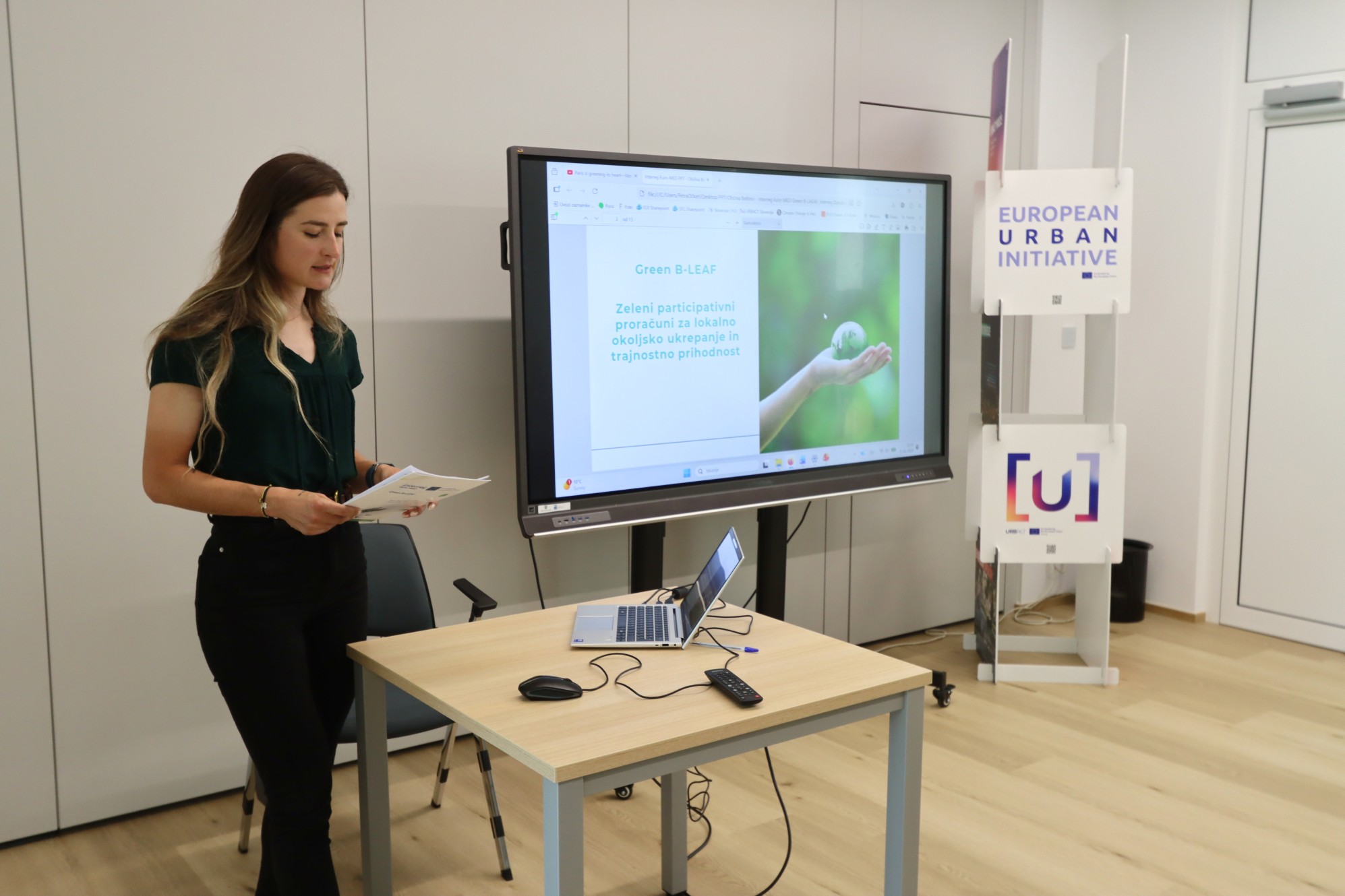 Kristina Koter z Občine Beltinci je predstavila projekt Green B-LEAF, ki spodbuja uporabo zelenih participativnih proračunov za krepitev lokalnih skupnosti v boju proti podnebnim spremembam. Poudarila je pomen vključevanja občanov v odločanje o okoljskih ukrepih, ki omogočajo trajnostno prihodnost. Izpostavila je, da bo ta pristop pripomogel k večji podnebni odpornosti območij, ki se soočajo s povečanim tveganjem za ekstremne vremenske pojave, kot so vročinski valovi in poplave. Poleg tega so razvili orodje za označevanje zelenih izdatkov (Green Budget Tagging), ki bo omogočilo bolj pregledno dodeljevanje sredstev za okoljske projekte in povečanje njihovega učinka. Na kratko je predstavila tudi projekt RurALL, v okviru katerega so naslavljali izzive depopulacije z skupnostnim razvijanjem programa za prazne stavbe.